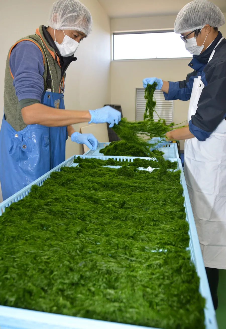 四万十市でノリの加工販売を手がける加用物産(井沢)が同市下田に整備した陸上養殖場で12日、四万十川流域の種苗を使ったスジアオノリの初収穫に成功した。同市産のノリは近年壊滅的な不作が続いており、ブランド維持への一歩となる。同社は年内の商品化を目指し、生産手法を改良しながら品質向上に取り組む。